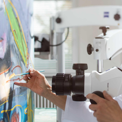 Microscopic examination constitutes the foundation of technical authentication. Through the use of stereomicroscopy and high-magnification metallurgical imaging, specialists are able to assess pigment particle morphology, stratigraphic layering, and the structural characteristics of the canvas support.
